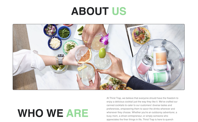 A full stack website for a canned cocktail company built with Bootstrap, React, and Firebase. The website features Google Maps API and Instagram API.